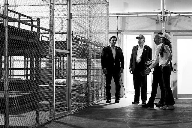 Now, in 2025, Florida has constructed a prison in a week out of tents, cages, and bunk beds in the Everglades. The highlighted feature is the swamp surrounding the facility, with one road in and an airstrip to facilitate deportations to other countries. Some people are excited about the prospect of alligators attacking and eating brown immigrants who might want to escape their inhumane treatment. Did I mention bunk beds in cages? What kind of toilets and plumbing were installed in one week? Let the record reflect that there are portable air conditioning units.
